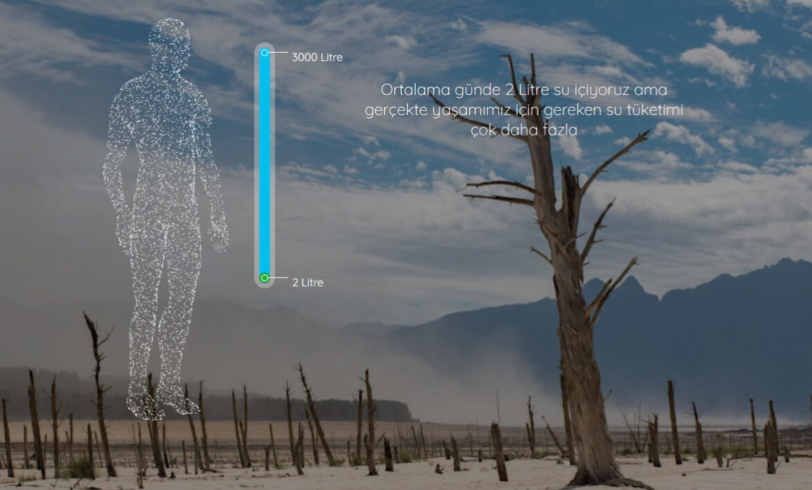 Ortalama günde 2 Litre su içiyoruz ama gerçekte yaşamımız için gereken su tüketimi çok daha fazla KULLANDIĞIMIZ HER ŞEYİN BİZE GELENE KADAR BİR SU TÜKETİM GEÇMİŞİ VAR. Bir jean pantolon üretimi için 1.000 lt su gerekir, bir çift yumurta üretimi için 880 lt su gerekir, Bir hamburger üretimi için 2.500 lt su gerekir.