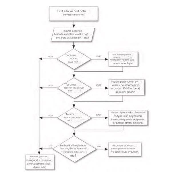 - Hem toplam alfa hem de toplam beta aktivitesi için ilk tarama yapılır. Ölçülen aktivite konsantrasyonları toplam alfa aktivitesi için 0,5 Bq/l ve toplam beta aktivitesi için 1 Bq/l’nin altındaysa, başka bir işlem gerekmez.