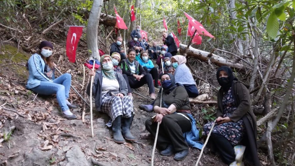 Rize’de İşkencedere Vadisi’nde çalışan iş makinelerine engel olmak isteyen köylüler, sabahın erken saatlerinde alana gitti. Jandarma yolları kapattığı için çalışma yapılan bölgeye ancak ormanın içinden geçerek varabilen köylüler, iş makinesinin önünde bulunan ağaçlara Türk bayrağı asarak direnişe geçti.
