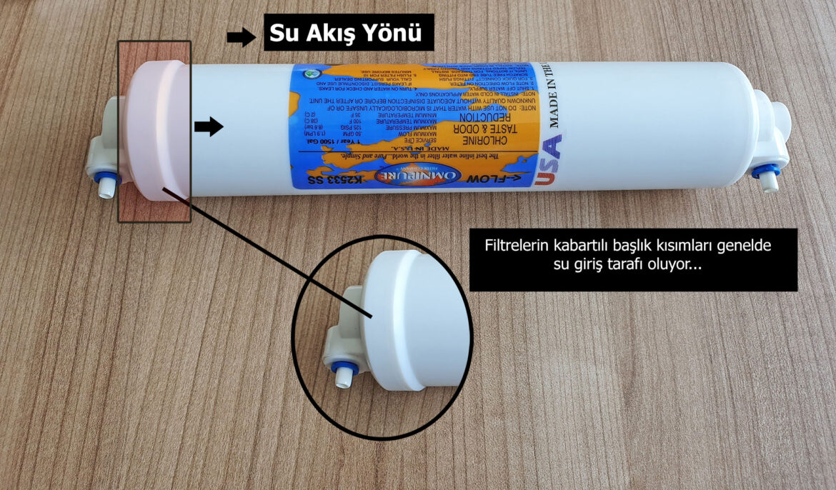 Yukarıdaki resmi incelersek genelde inline filtrelerin giriş başlık kısımları hafif çıkıntılı olur genelde tüm filtrelerde bu kısım filtrenin girişi oluyor eğer iki tarafı da aynı başlıklı yada bu başlık yoksa filtre gövdesinde Flow yazan bir kabartma vardır buda su akış yönünü göstermektedir.