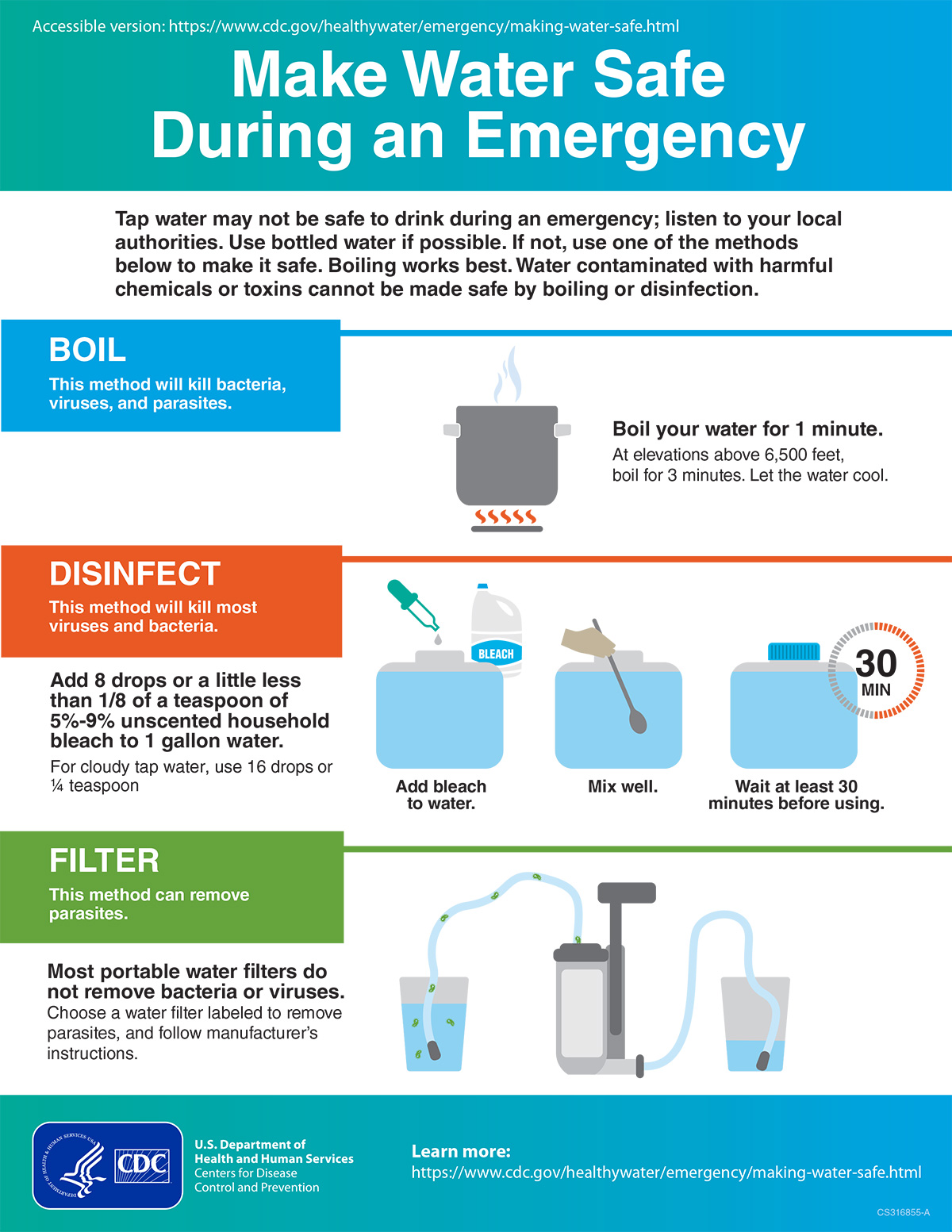In an emergency, water contaminated with germs can often be made safe to drink by boiling, adding disinfectants, or filtering.