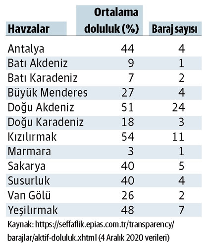 Enerji Piyasaları İşletme Anonim Şirketi (EPİAŞ) tarafından paylaşılan 68 barajdaki su seviyelerinin mevcut durumuna değinerek değinen Deniz Ataç, “Bu verilere göre Batı Akdeniz, Batı Karadeniz, Marmara Havzalarında baraj seviyeleri yüzde 3-9 arasında olup çok düşük, Doğu Karadeniz ve Van Gölü havzalarındaki barajlarda ise düşük durumda.” Ataç’ın ifade ettiği gibi, asıl sorun İstanbul, İzmir ve Ankara başta olmak üzere içme suyu sağlanan mevcut baraj doluluk oranlarının az olması. COVİD-19 salgını nedeniyle su kullanımının daha da arttığı 2020 yılında, baraj seviyeleri özellikle İstanbul ve İzmir için oldukça düşük durumda. Kış ve bahar döneminin de sonbaharda olduğu gibi kurak geçmesi, 2021 yılında ciddi bir su sıkıntısı doğabilecek.